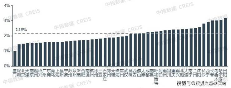 根据中指监测数据,2024年3月,50个重点城市租金房价比平均为2.15%,处于较低水平。50城中,26个城市租金房价比低于2.0%。厦门租金房价比仅为1.0%,深圳、北京、南京等核心一二线城市房价较高,租金房价比相应较低,在1.5%左右。