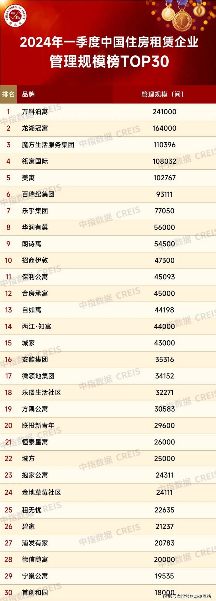 据中指研究院统计,截至2024年一季度末,TOP30集中式长租公寓企业累计管理房源量达165.9万间,较2023年四季度增加3.1万间。其中,TOP5企业累计管理规模为72.6万间,较上季度末增加1.1万间,占TOP30总规模比重为43.8%,与上季度末基本持平。2024年一季度末,管理规模TOP30入榜门槛为18000间,较上季度末微增222间。