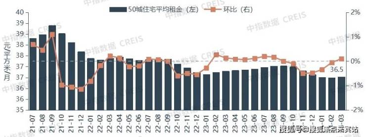 2024年一季度,住宅租金累计微幅下跌。根据中指研究院50城住宅租赁价格指数,2024年一季度50城住宅平均租金累计下跌0.29%。分月度来看,1月、2月受春节假期影响,租房需求释放有所放缓,住房租赁市场处于传统淡季,租金环比保持下跌态势;3月,受节后人员返城、工作变动等因素带动,租房需求集中释放,住房租赁市场逐步进入旺季,3月50城住宅平均租金为36.5元/平方米/月,环比止跌转涨,同比仍下跌0.73%。
