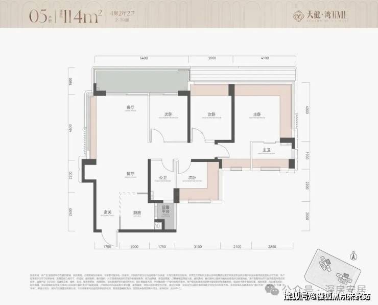 114㎡4房2卫,竖厅户型,朝北对着金众,户型结构和113完全一样,就是客厅也做了一面4.5米宽的凸窗;