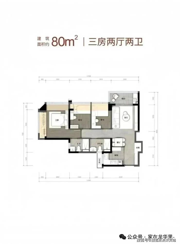 80㎡的3房2厅2卫,设计为竖厅,客厅宽3.3米,LDKB布局,S墙预留冰箱位,动静分区。主卧16.38㎡,次卧8.16㎡和7.84㎡(含飘窗)。U型厨房,卫生间干湿分区。得房率79.6%(不含赠送),阳台4.95m²朝东北。套内面积63.98m²+赠送11.55m²=实用面积75.53m²,含赠送得房率94%。