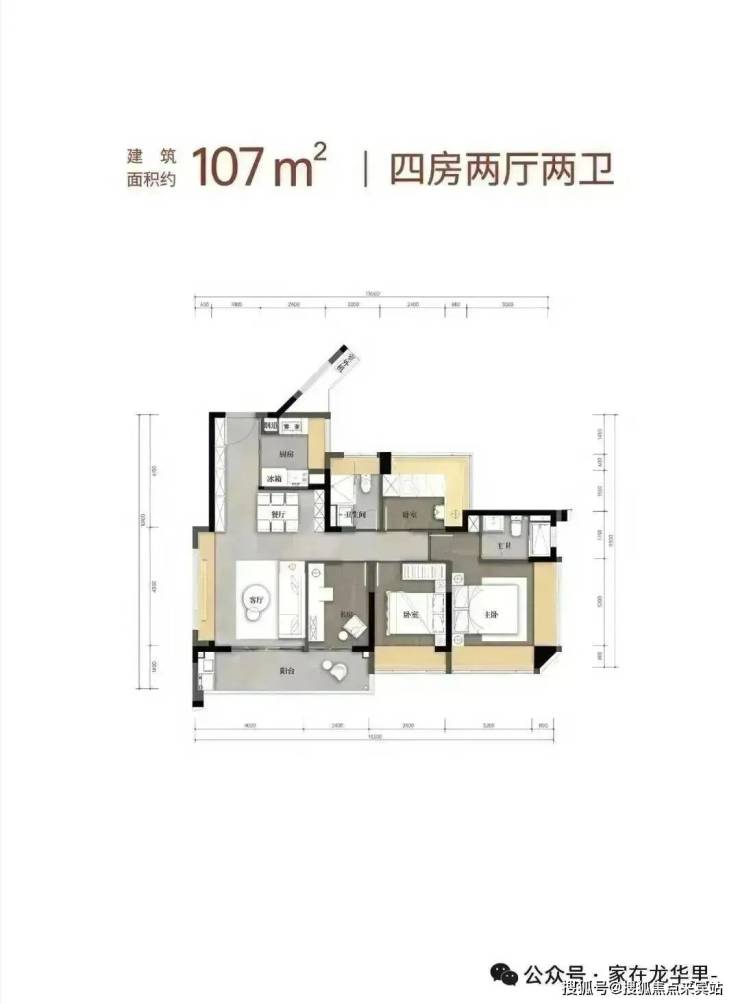 1的4房2厅2卫,经典竖厅设计,客厅4米宽,LDKB一体,预留冰箱位,动静分区。主卧17.18㎡,次卧11.2㎡、8.64㎡、7.68㎡(含飘窗)。U型厨房,卫生间干湿分离。得房率79.6%(不含赠送),客厅连10.24m²阳台,东南向。套内85.19m²+赠22.96m²=实用108.15m²,赠后得房率101.08%。