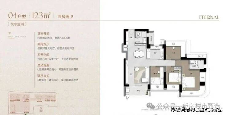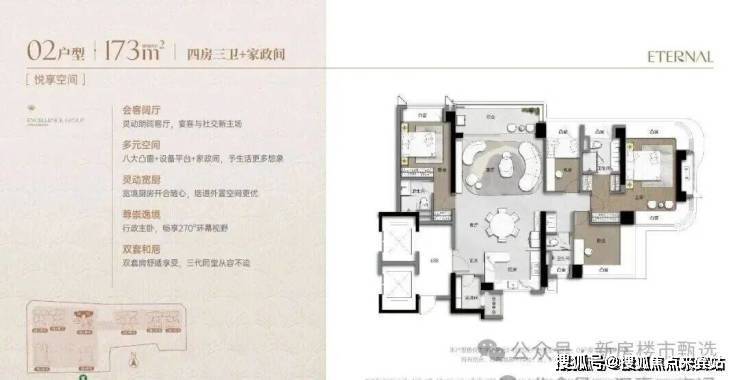 173m²的4房2厅3卫+家政间,设计的是竖厅类双龙抱珠格局,独立电梯厅入户约8.13㎡,客厅5.55米开间,LDKB一体化设计,主卧套房270°环幕凸窗+私享阳台,八大凸窗+设备平台+家政间,分别做到了主卧27.1㎡/次卧14.87㎡/次卧12.38㎡/次卧8.38㎡/家政间2.93㎡+阳台1.38㎡(实测面积,去掉墙体),U型厨房,公卫三段式干湿分离,得房率超90%(包含赠送),阳台9.56㎡正北朝向,看会展中心+市民广场。