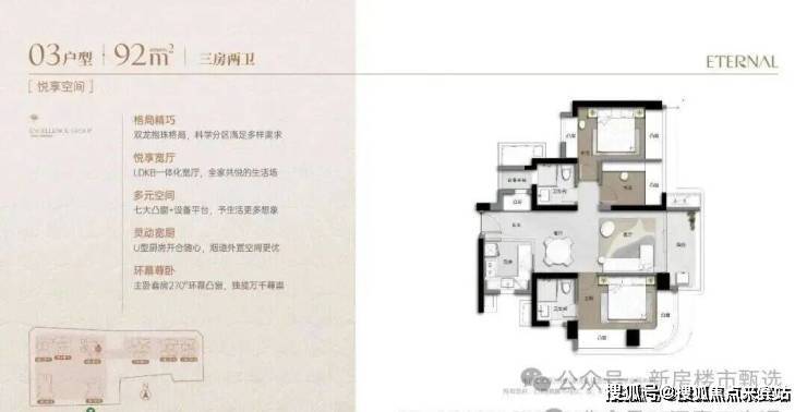 92m²的3房2厅2卫,设计的是双龙抱珠格局,客厅3.2米开间,LDKB一体化宽厅,主卧套房270°环幕凸窗,七大凸窗+设备平台,分别做到了主卧16.06㎡/次卧12.82㎡/次卧6㎡(实测面积,去掉墙体),U型厨房,卫生间干湿分离,得房率超90%(包含赠送),阳台实测6.54㎡正东朝向。