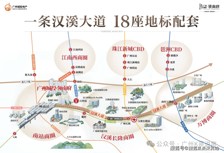 一条汉溪大道,串联南站商圈、江南西商圈、汉溪长隆商圈、珠江新城CBD、琶洲CBD和万博商圈,城市繁华便捷可享。