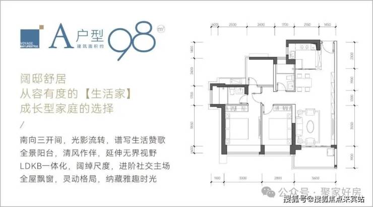 98㎡的3房2厅2卫,设计的是经典竖厅格局,LDKB一体化设计,客厅3.6米开间,三开间朝南,动静分区,3个卧室分别做到了主卧13.69㎡/次卧11.62㎡/次卧5.76㎡(包含墙体飘窗),都不用搭配飘窗做床,L型厨房,卫生间干湿分离,得房率约:89%(包含赠送),西南、东南或正南朝向。