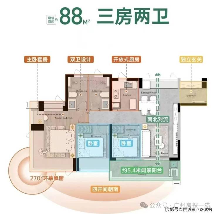 建面88平A1户型,南北对流,四开间朝南