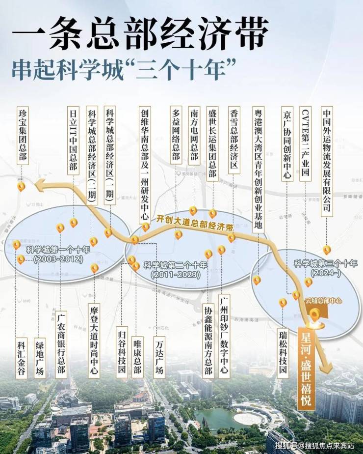●开创大道是科学城最光鲜的门面担当,作为“总部经济带”,聚集了南方电网、创维、日立IT等二十多个企业总部,它的重要地位,类似于广州新中轴,串起了科学城的过去、现在和未来