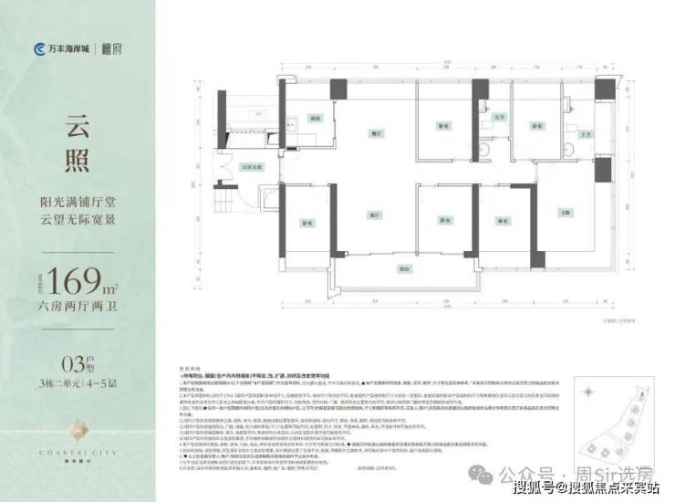 169㎡的6房2厅2卫,设计的是竖厅南北通透格局,独门独户,赠送私用公区走道,客厅4.15米开间,餐客厅分离设计,五开间朝南,主卧270°无柱转角飘窗,分别做到了主卧19.93㎡/次卧12.18m²/次卧11.45m²/次卧10.71㎡/次卧9.88m²/次卧9.86㎡(包含墙体飘窗),U型厨房,公卫三段式干湿分离,得房率约100%(包含赠送),7.05米长的超大观景阳台约12.33m²主朝东南向。赠送面积约31.69m²。