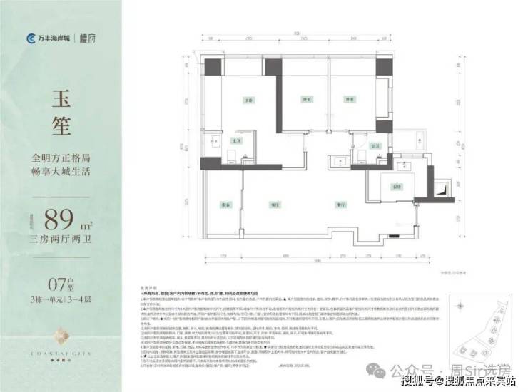 89㎡的3房2厅2卫,设计的是竖厅格局,客厅3.375米开间,LDKB一体化,S墙设计预留冰箱卡槽位,三开间朝南,动静分区,分别做到了主卧16.5㎡/次卧10.27m²/次卧8.85㎡(包含墙体飘窗),U型厨房,公卫三段式干湿分离,得房率约95%(包含赠送),阳台5.9m²西南朝向。赠送面积约14.69m²。