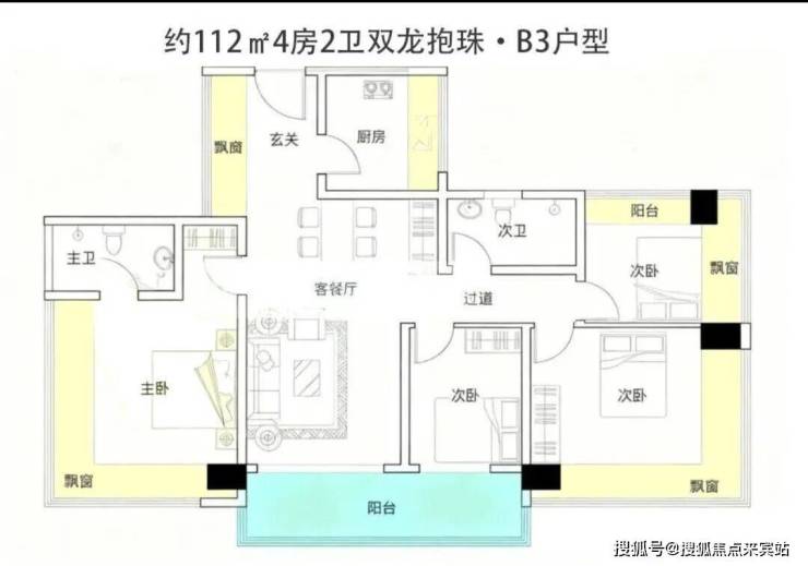 约105-122㎡四房:作为“功能型品质起步”户型,凭借新规下的高实用率(包含赠送得房率约100%)选。主卧均带270°环绕式飘窗,户型设计通过飘窗“送了不少面积