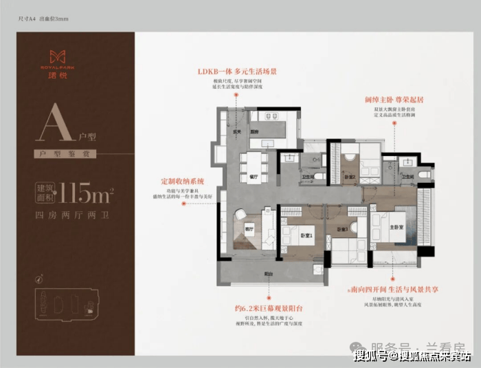 115㎡四房二卫A/B户型,大阳台,主卧通过凸窗赠送衣柜,但次卧尺度都偏小。