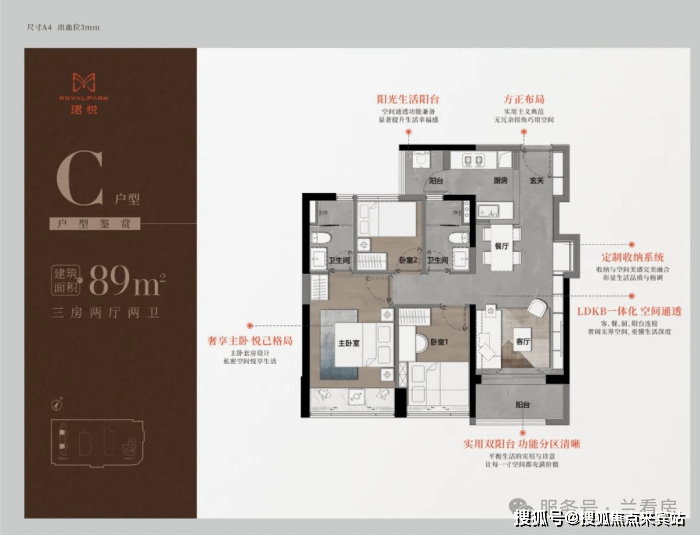 89㎡三房二卫A/B户型,位于1栋一单元,两开间阳台,主卧都有双面凸窗赠送。