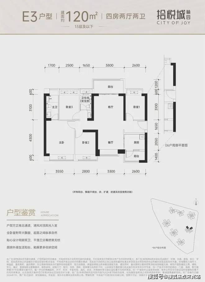 120平-140平,设计的是横厅南北通透格局,进门入户玄关,客餐厅6.3米开间,无过道设计,4个卧室分别做到了3.55米/3米/3米/2.8米的宽度,U型厨房,公卫三段式分离,得房率:74.31%(不含赠送),阳台1.8米宽度,主朝西南或东南向。