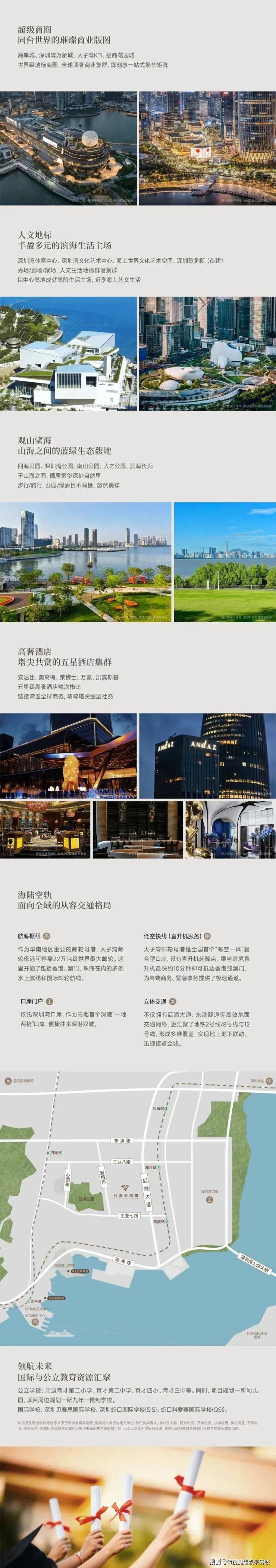 商业:周边社区成熟,有不少老店和街市,能满足日常生活需求。最近的大型商场有宝能太古城700m,2公里内还覆盖有万象城、海岸城、天利名城、来福士广场、蛇口招商花园城等多个大型购物中心,顶奢消费场景密集。