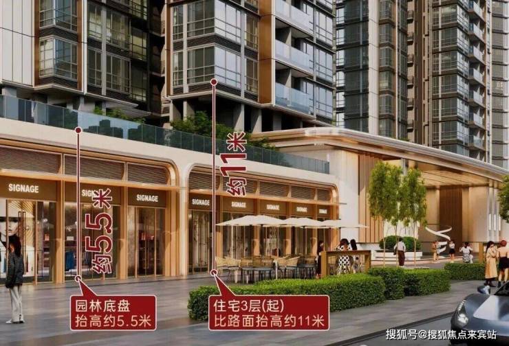 社区园林整体抬升约 5.5 米,住宅自3楼起,标高较外部地面高出约11米。