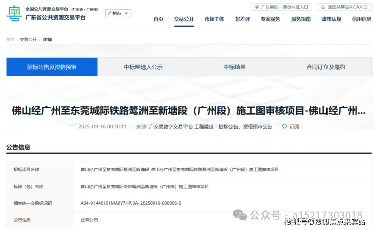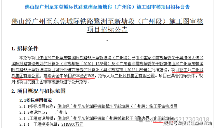 9月16日,佛穗莞城际广州段同步启动3个招标,包括施工图审核、规划测量、控制测量及施工测量检测工程项目。招标公告显示,线路已获得《广东省发展改革委关于新建佛山经广州至东莞城际铁路鹭洲至新塘段项目可行性研究报告的批复》,项目业主为广州地铁集团有限公司。