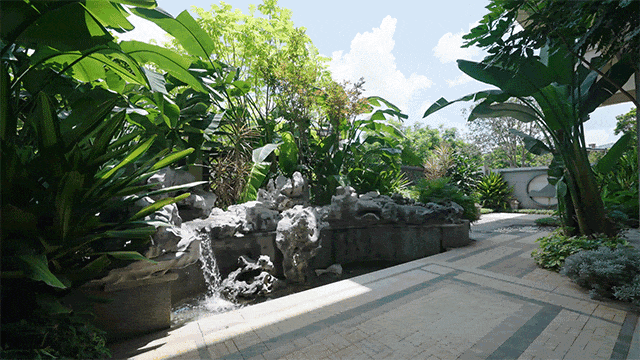 在占地面积约12.5万㎡的园林中,“石、水、光、林、云”等五大自然元素,被诗意、艺术、美学浸润。耗资过亿重金打造,栽种约400米香樟大道、非洲进口加拿列海枣名贵树种,全冠移植的十八学士白茶花,搭配多种季节性水果树名贵绿植,葱绿苍翠,鲜氧富盈。精选奢贵黄蜡石,打造活水溪流、叠水瀑布,在移步异景之中,找到久违的片刻宁静。