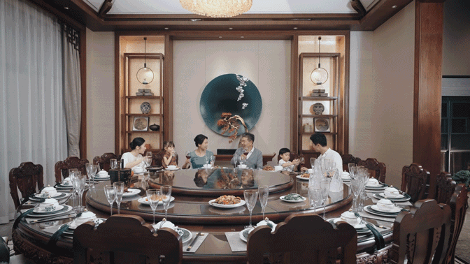 富一层的厨房餐厅,中式厨房+西式岛台,中餐西点一并拿捏,在烹饪中,家的温暖也随时升温。在寓意团圆的中式大圆桌上,味蕾因子、笑声和烟火气一同沸腾,窗外夏风、蝉鸣、微风来伴奏,家的交响曲进入高潮。