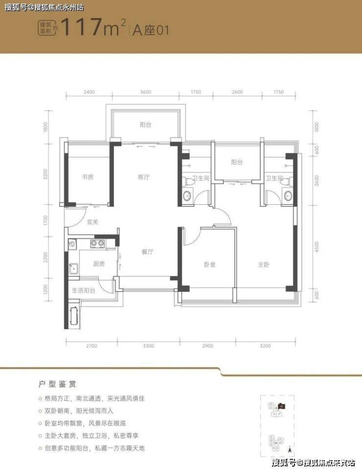 117平四房两卫户型:格局方正,南北通透,采光通风俱佳,双卧朝南,阳光倾泻而入,卧室均带飘窗,风景尽在眼底,主卧大套房,独立卫浴,私密尊享,创意多功能阳台,私藏一方志趣天地。