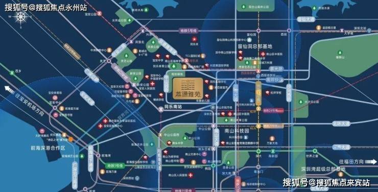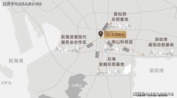 后海金融总部基地、深圳湾超级总部基地(东南向约6km):中国总部企业最为密集区域之一,规划就业人口约为54万人。