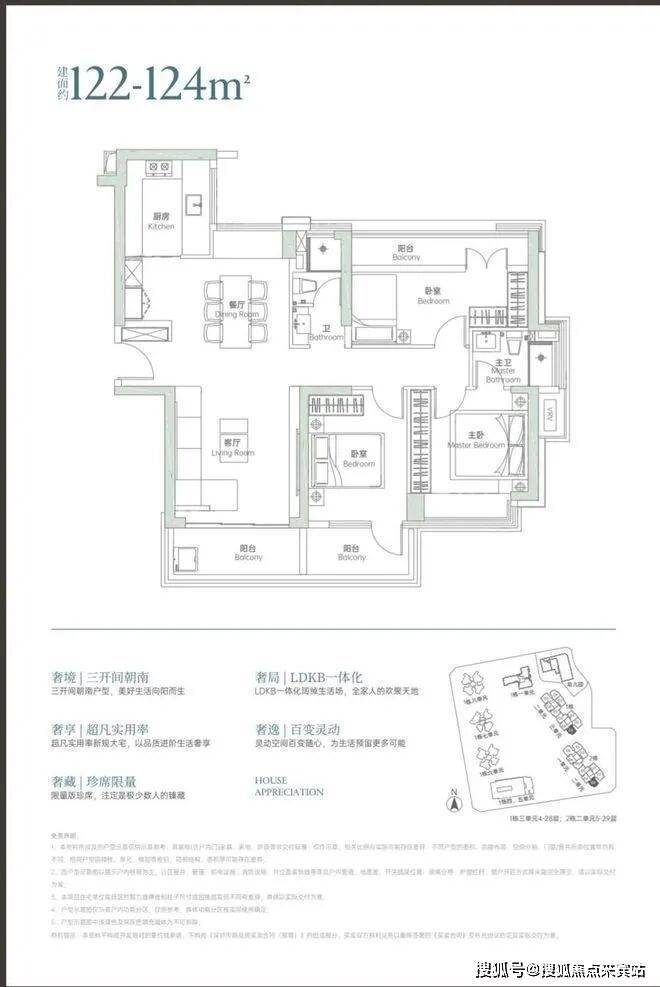 商品房有约923套105-124-144-190-220-260-280㎡的3-6房和少量特色单位,户型选择比较多。