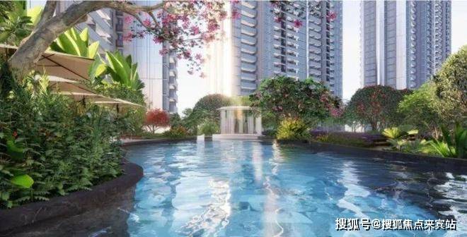 园林请的是新加坡团队设计,度假风满满,约4000㎡的空间里泳池、阳光草坪、休闲吧台、童趣乐园、康养中心全部配齐。
