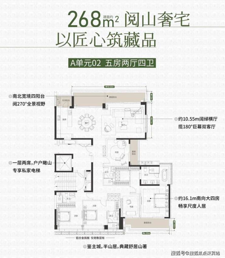 同样的专梯入户,豪宅感扑面而来,该户型为顶级大户型,四阳台设计,最大有10.55米的景观阳台和180度视野的餐客厅空间奢阔气场尽显,罕见的南北瞰景四阳台设计,让家的每个角落都能欣赏美丽的山景和城市景观。所有的开窗面都尽可能放大,客餐厅、书房、卧室、几乎都能享受超宽超大屏