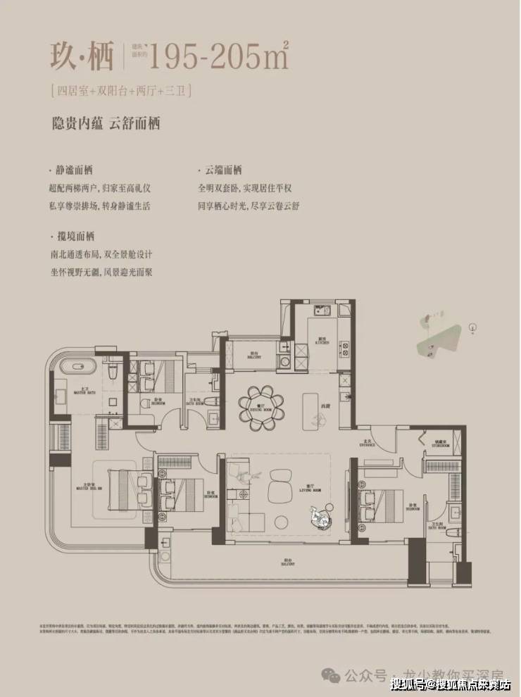 195-205㎡4房3卫:独立电梯入户,中西双厨房,餐客厅一体,双套房设计,端头主卧南北通透,户型方正,四开间朝南,3面采光,整个户型十分通透大气。