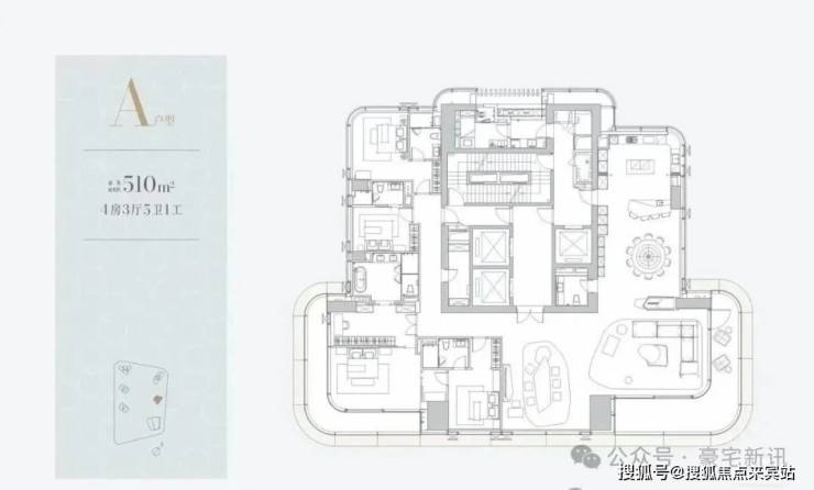 1A栋(1栋一单元)-43层:3梯1户,约510㎡,一层一户,私密性极致,为项目旗舰户型。