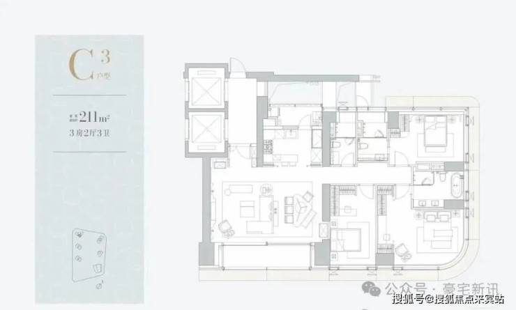 1C栋(1栋三单元)-51层:4梯3户,约210㎡,为一期的入门级户型,一层三户。