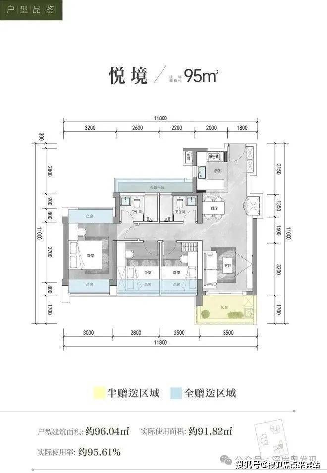 95㎡的3房2厅2卫,设计的是经典竖厅格局,进门入户玄关,S墙设计预留冰箱卡槽位,四开间朝南,还带1个超大设备平台,得房率约95.47%(包含赠送),东北朝向。
