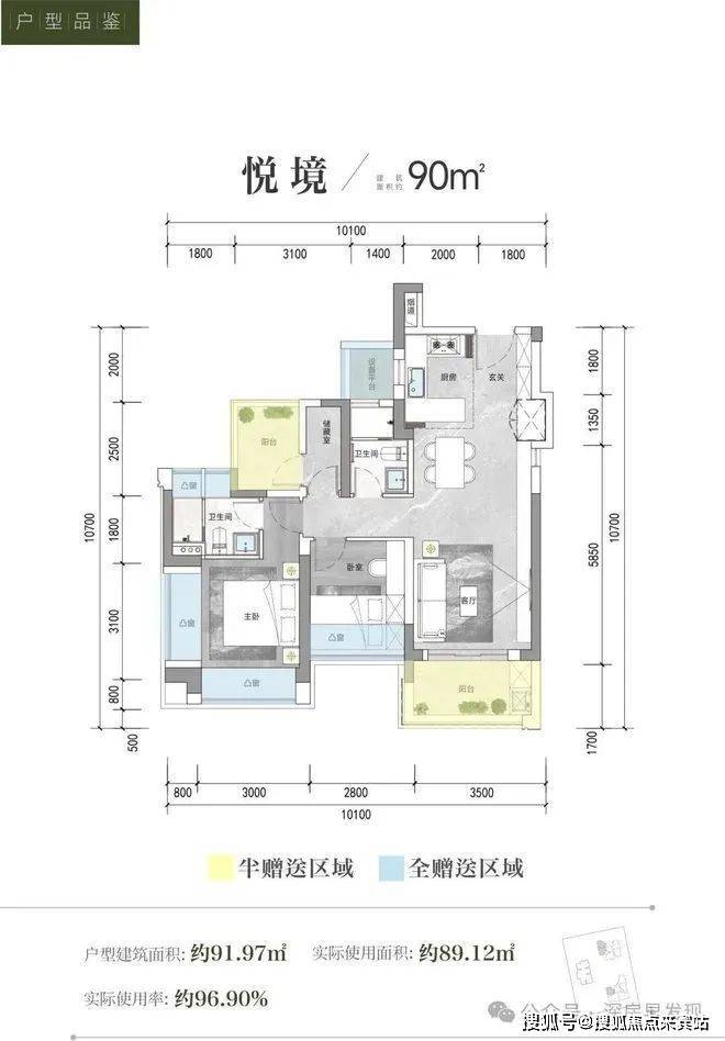 90㎡的3房2厅2卫,设计的是经典竖厅格局,进门入户玄关,S墙设计预留冰箱卡槽位,三开间朝南,还带1个设备平台,得房率约94.1-95.74%(包含赠送),西南朝向。