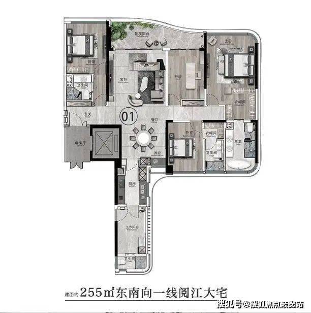 其中,1栋最靠近江边,户型涵盖233㎡/335㎡四房,为三梯两户设计。