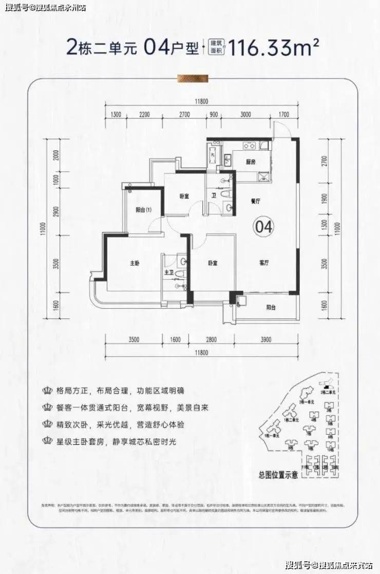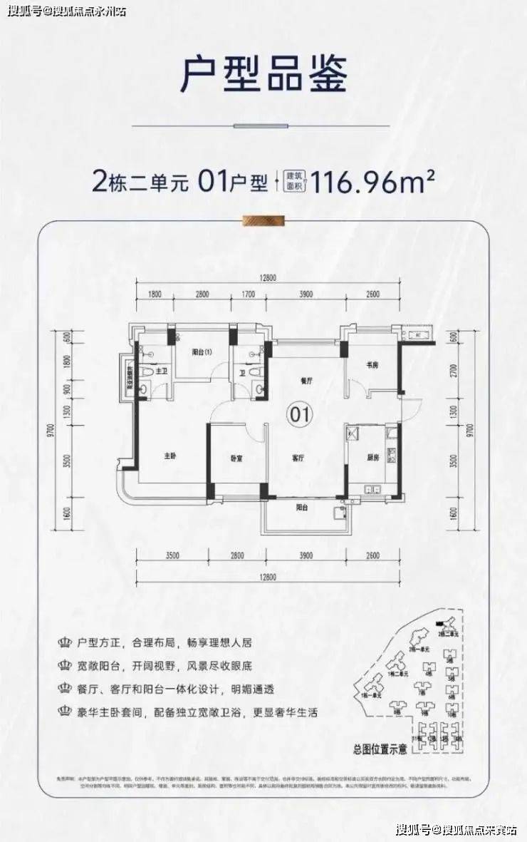项目户型介绍:社区产品面积段包括112-116-120㎡4房2卫,195㎡4+1房4卫,本次推出116户型4房2卫