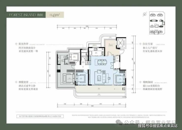 以主力在售的建面约143㎡四房户型为例,空间利用率超100%,营造全方位度假体验。一梯一户与独立电梯厅赋予归家仪式感;约5.7米宽厅连接约11米阳台,将自然融入起居;主卧270°转角视野与套房设计,让每一天在风景中醒来。