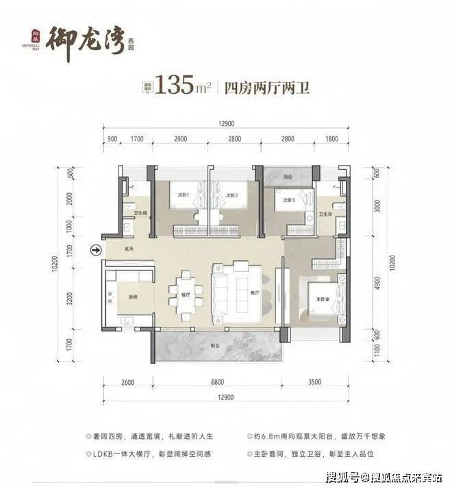 135㎡4房2卫,设计的是横厅南北通透格局,客餐厅开间6.8米,LDKB一体化设计,四开间朝南,U型厨房,公卫三段式分离设计,得房率约79.25%(不含赠送),阳台主朝东南或西南向,加上赠送得房率约90%