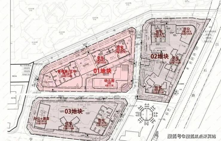 01地块总规划1038套,其中保障房612套、回迁179套、可售商品房247套。容积率9.28,梯户比,车位比为1:0.83。
