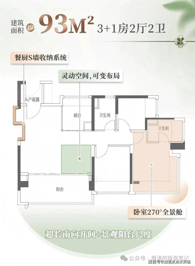 79平户型三开间朝南的设计,双卧室均配备L型飘窗;让阳光能毫无遮挡地洒进每个房间;超大宽厅,既可以作为家庭聚会的大客厅,也能通过灵活隔断改造成第三间独立卧室;