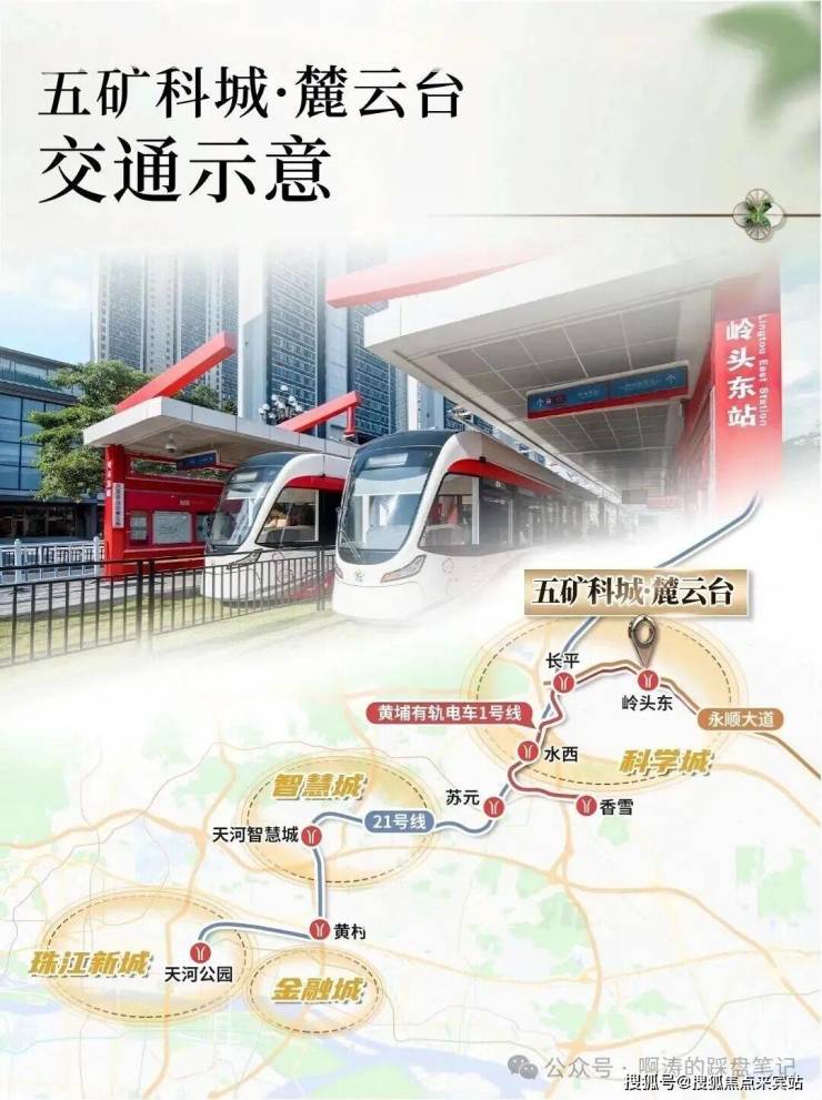 麓云台就在黄埔有轨电车1号线岭头东站旁边,距广州地铁21号线长平站约3.3公里,可以直达黄埔区府板块,或者5站长平换乘21号线去往天河也足够便利。如果自驾的话,永顺大道可以直达黄埔科学城,经过广汕路也能直达天河智慧城。