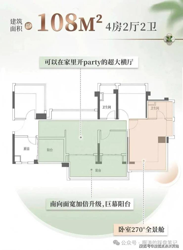 108平户型,拥有加倍升级面宽的巨幕阳台,超大横厅在家就能开party!