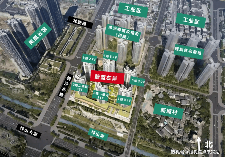 蔚蓝左岸项目位于坪山区碧沙北路与坪山大道交汇处北侧,位置比较偏边缘,项目南面紧邻坪山河,高楼层可以远眺马峦山,北侧和东侧分别是龙光在碧岭新开的一个楼盘龙光玖榕府和厂房以及新屋村,西侧一路之隔就是二手小区凤凰公馆!