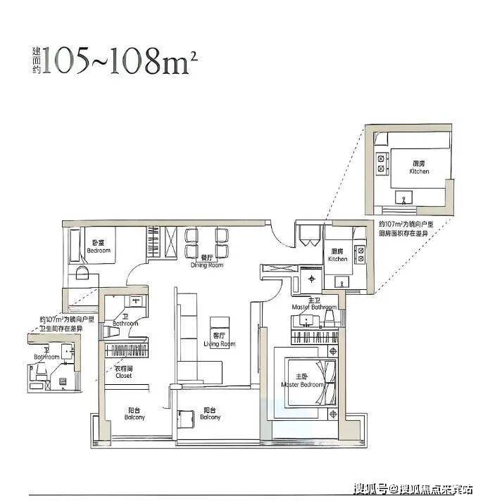 105㎡三房两卫采用房间左右侧设计,传统说法双龙抱珠,基本没有浪费空间,户型拓展率大,阳台以实体样板房为准;