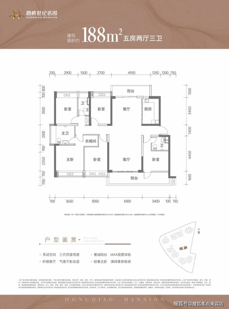 188㎡的5房2厅3卫,设计的是竖格局,南北通透双阳台,客厅4.3米开间,LDKB一体化设计,双主卧套间设计,5个卧室分别做到了主卧14.6㎡/套间9.22㎡/次卧13.2㎡/次卧12.18㎡/次卧11.34㎡(包含墙体飘窗),L型厨房带1个小生活阳台,公卫三段式分离,客厅阳台连接次卧出7.7米长的大阳台,得房率约73.5%(不含赠送),主朝正南向。