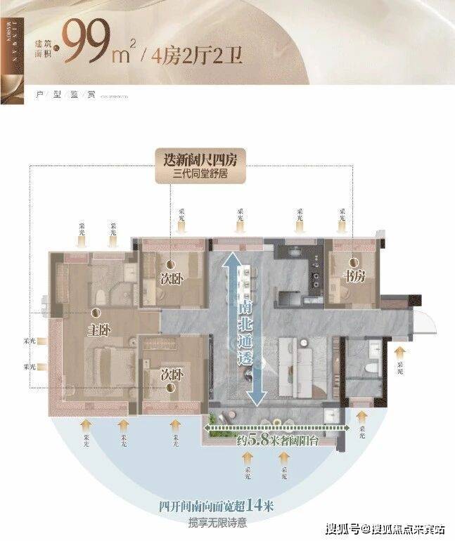 ☑️ 约99㎡奢阔4房|近乎传统120㎡舒适感✨约14米南向面宽+约5.8米阳台,客餐厅南北对流✨约5.8米横厅平层空间质感,更懂生活的奢阔尺度✨约25㎡套房主卧+270°L型飘窗,非凡起居日常