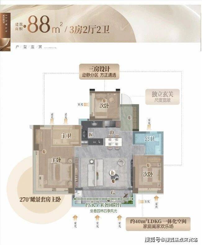 「四代宅」产品力 刚需面积兑现改善生活☑️ 约88㎡舒适3房|媲美传统100㎡三房✨约40㎡LDKG一体化阔厅,是家庭社交核心场域✨约5.7米宽景阳台,打造“城市微度假”的私域✨270°瞰景套房主卧,让私密与仪式感双重在线