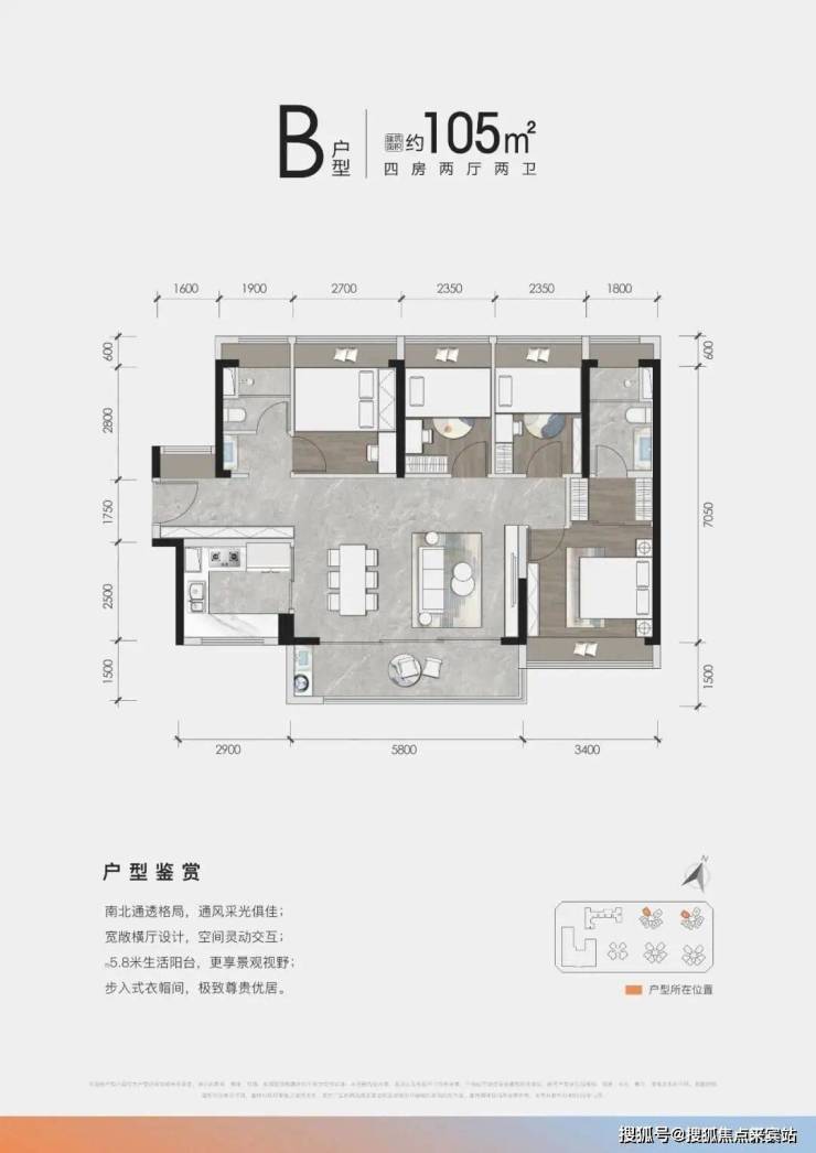 户型面积105平四房两厅两卫采用横厅设计,打造餐客厅+阳台一体化,于1+1>2的效果赋予空间更大想象,扩展家庭活动区域的同时,也提升整体空间通风及采光性,会客待友、休憩娱乐均可轻松满足,让家人的幸福指数直线上升。