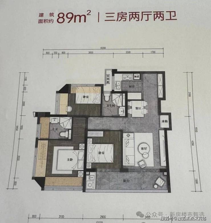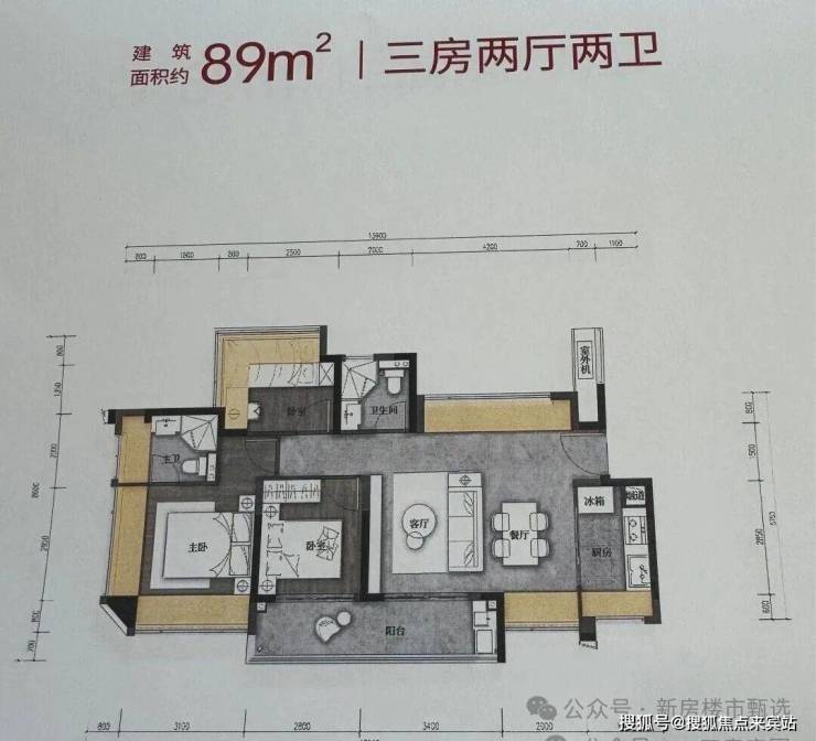 建筑面积约89㎡户型-3房2卫(横厅)