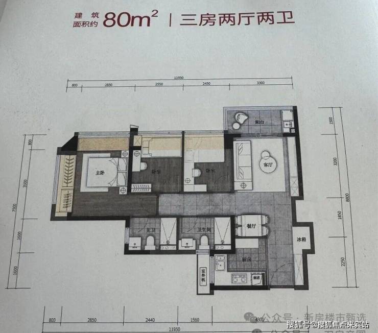 建筑面积约80㎡户型(竖厅)-3房2卫