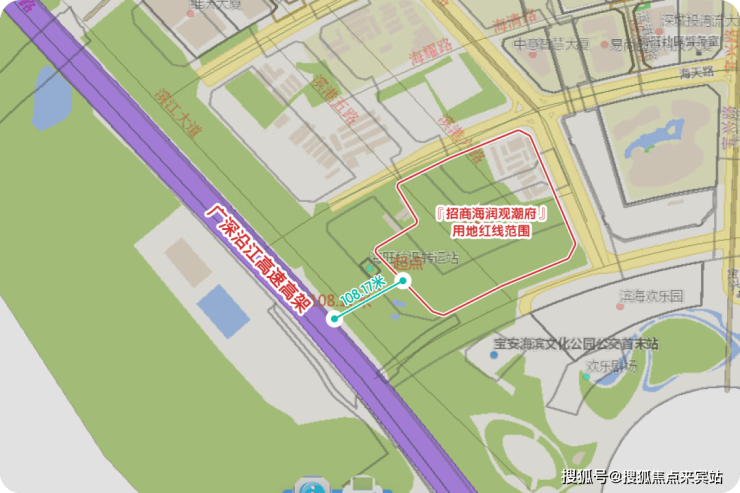 项目南侧一路之隔的欢乐港湾西岸仅 10-15 米,建筑高度过此即可南向看海看桥;东侧紧邻金科路、滨海廊桥,距宝中万豪酒店等建筑约 100-110 米,宝安青少年宫等市级公建近在眼前,东向直望宝中、南山、前海高层,视野开阔;北侧为海天路,一路之隔是待出让的北街坊地块,周边已建成 vivo 深圳总部等近 20 栋高端写字楼,多栋总部大楼正在建。